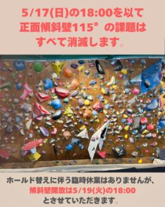 ⚠️5/17(日)の18:00をもって、正面傾斜壁(115°)の課題は5月マンスリーも含めすべて消滅します。