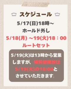 ※ ホールド替えに伴う臨時休業はありませんが、115°傾斜壁の開放は、5/19(火)18:00からとさせていただきたいと考えています。ご不便をおかけして申し訳ありません🙏